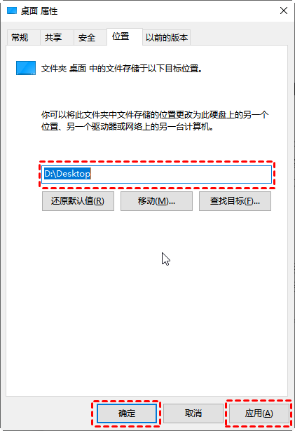 步骤 4. 浏览并选择刚才在D盘创建的"桌面"文件夹,点击"确定"。系统会提示是否将原文件移动到新位置,选择"是"即可。
