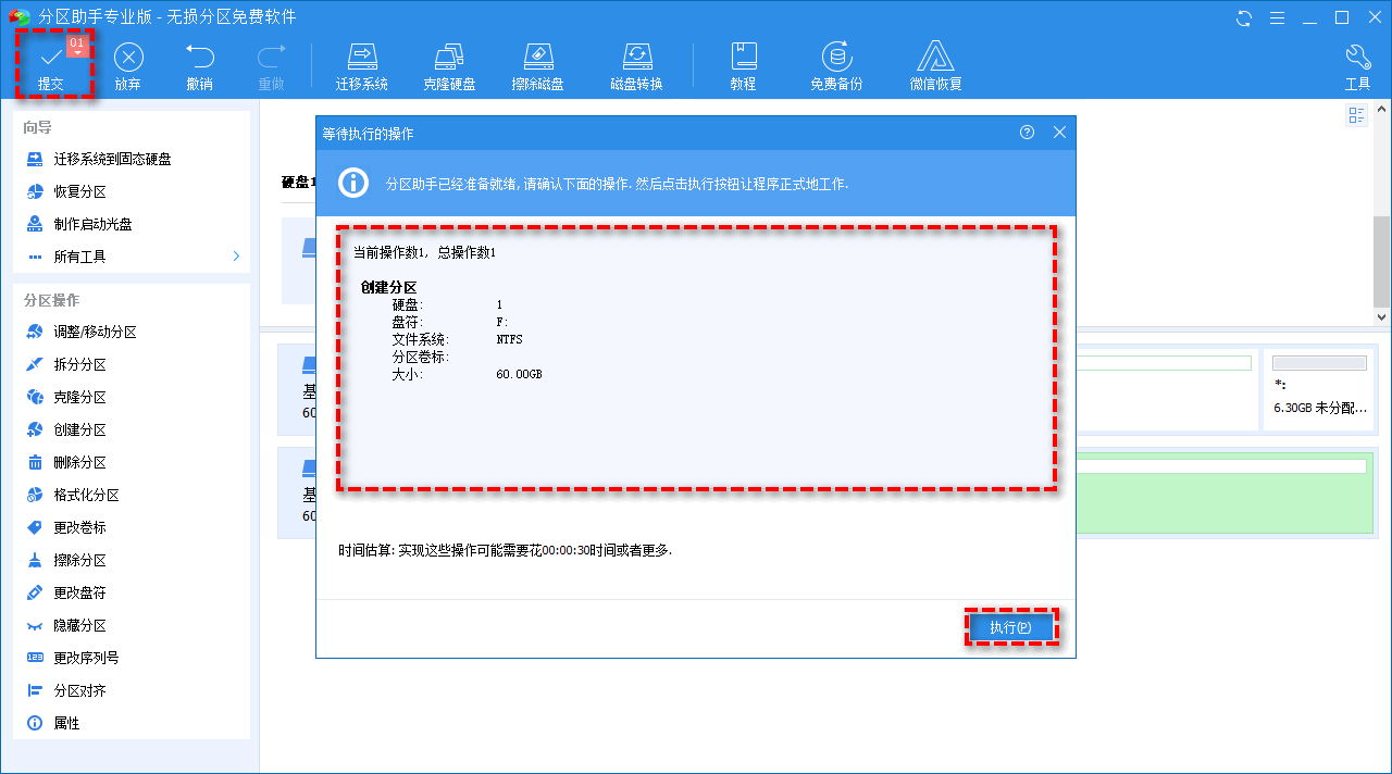 主界面点击"提交"按钮,预览即将执行的操作。确认无误后点击"执行",软件会自动重启进入PE环境完成扩容。