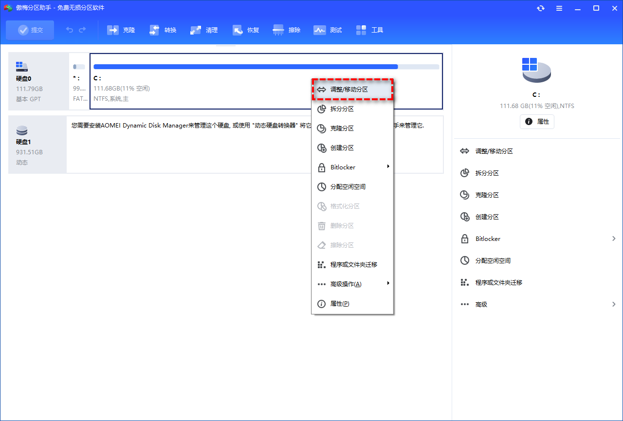 步骤1. 下载安装傲梅分区助手,打开软件后右键单击C盘,选择“调整/移动分区”。