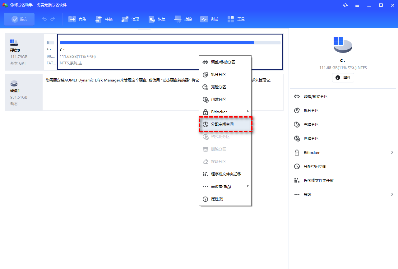 很多用户在尝试如何扩大C盘容量时,会发现磁盘管理中的“扩展卷”按钮是灰色的,这是因为C盘右侧没有紧邻的未分配空间。这时候,傲梅分区助手的“分配空闲空间”功能简直就是黑科技般的救星。