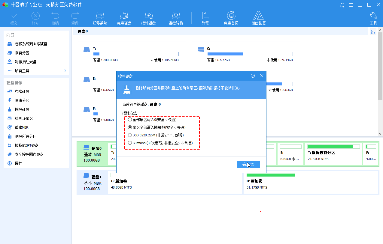 2. 在弹出窗口中选择你想要使用的擦除方式,然后单击“确定”。