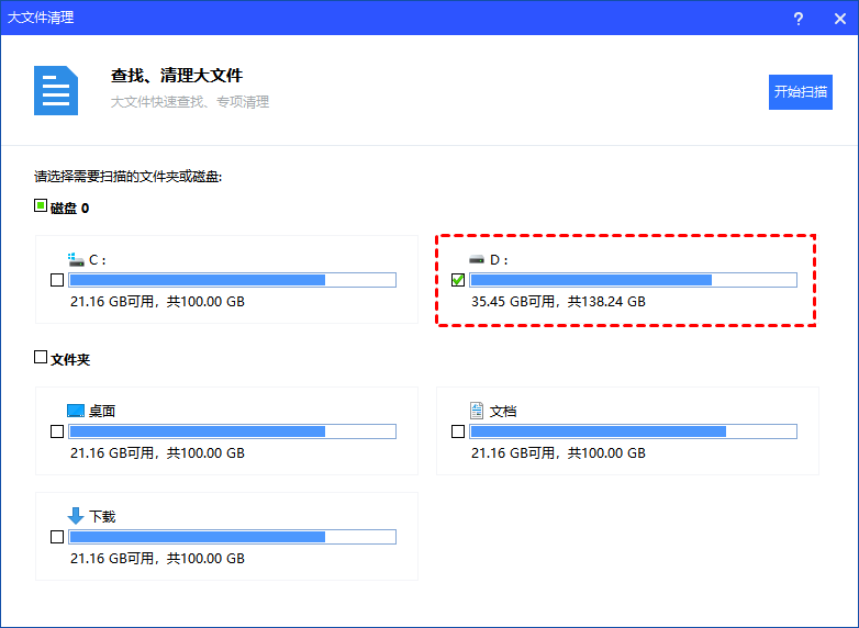 2. 在驱动器选择界面,勾选那个红得刺眼的C盘,然后点击"开始扫描"按钮。软件会自动扫描C盘中所有超过设定大小的文件。