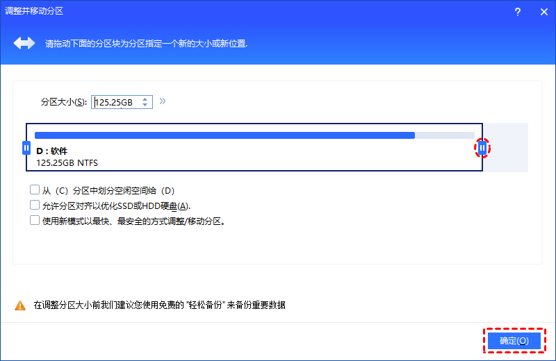 步骤2:在弹出的窗口中,直接拖动右侧的圆点向左滑动,空出的部分就是我们要分出来的 D 盘,点击“确定”。