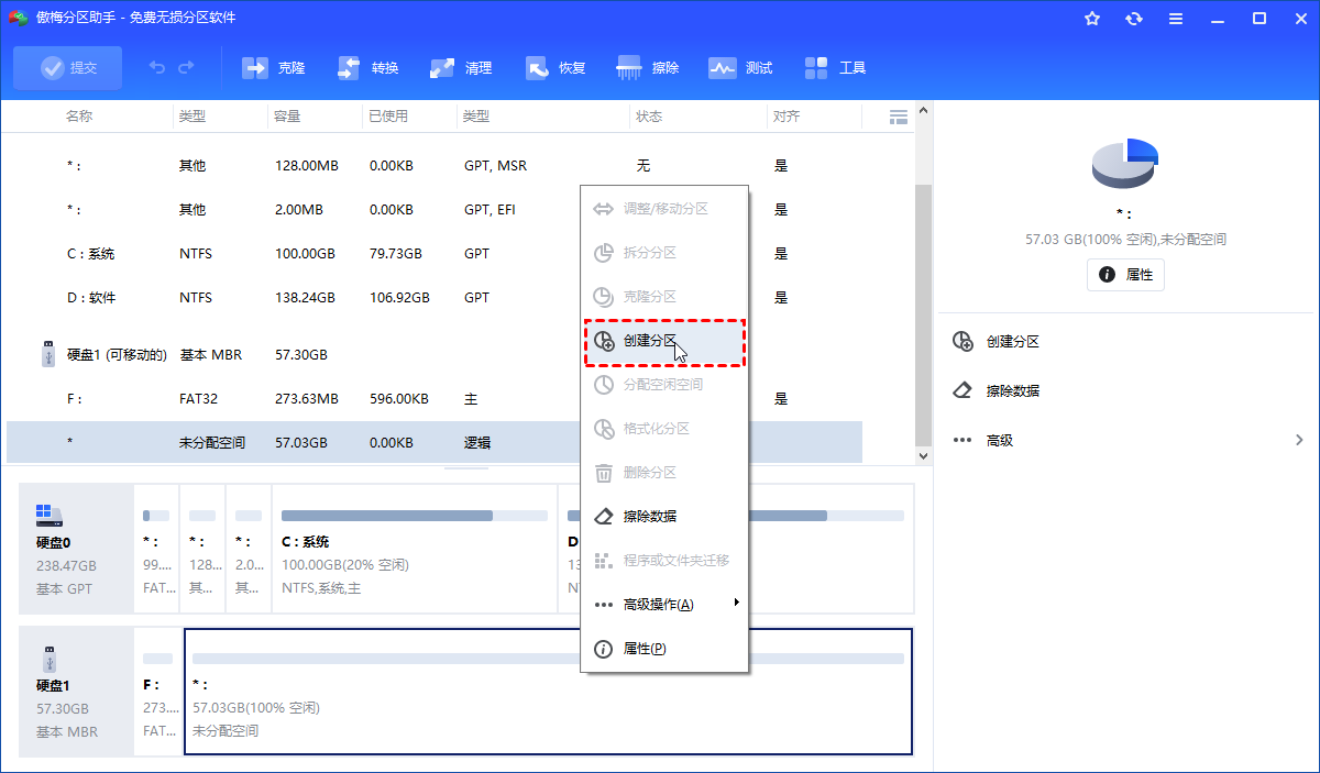 步骤3:此时你会看到一块“未分配”空间,右键点击它并选择 “创建分区”。