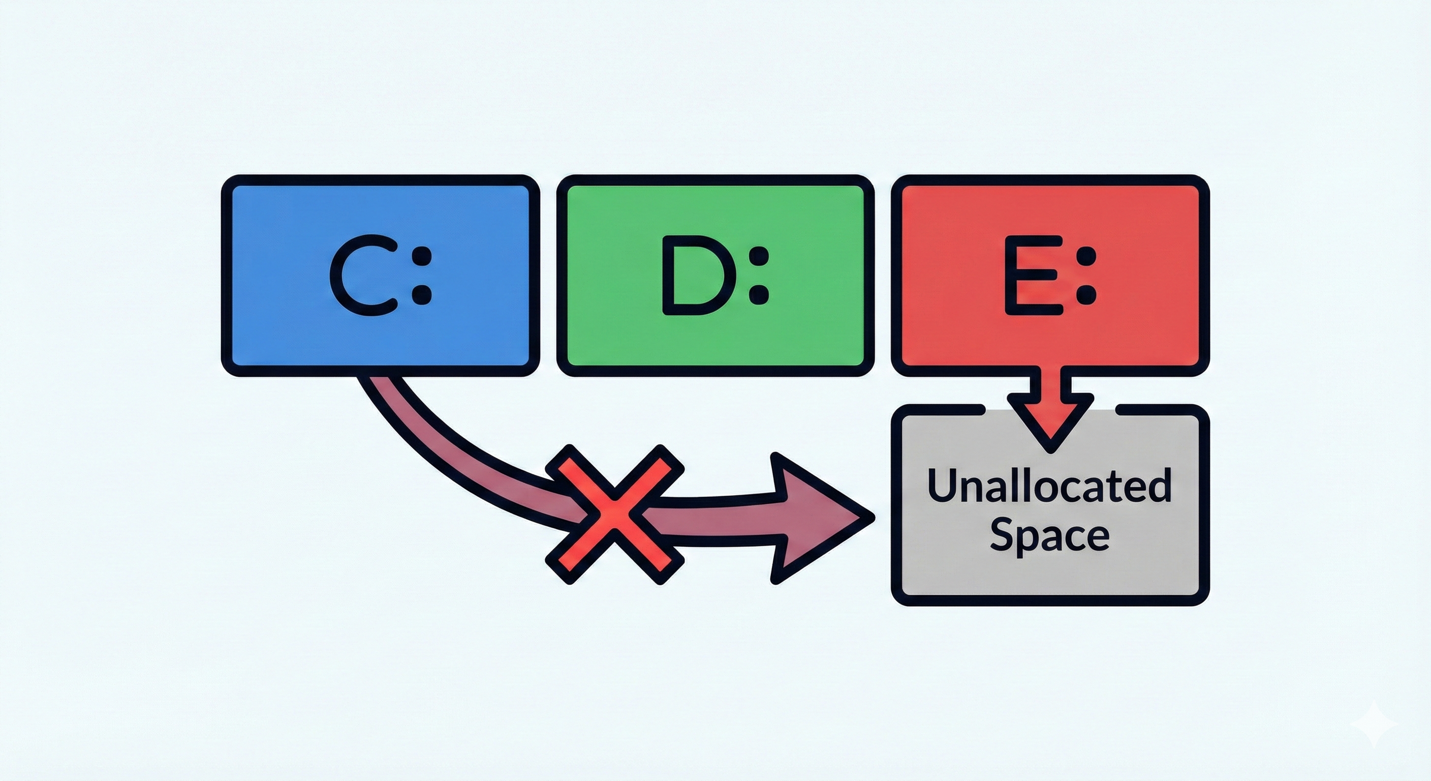 想解决E盘与C盘不相邻怎么合并的问题,首先要搞懂系统自带的磁盘管理工具的短板——它只能将与目标分区相邻且位于右侧的未分配空间,合并到目标分区中。
