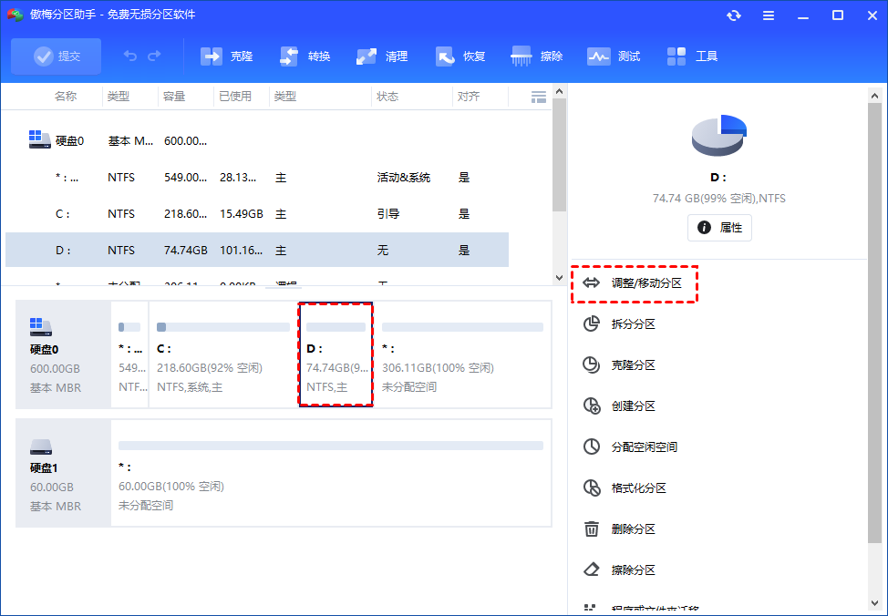 步骤1. 下载安装启动傲梅分区助手,选择要调整的D盘。在软件界面右侧的功能列表中,点击"调整/移动分区"。