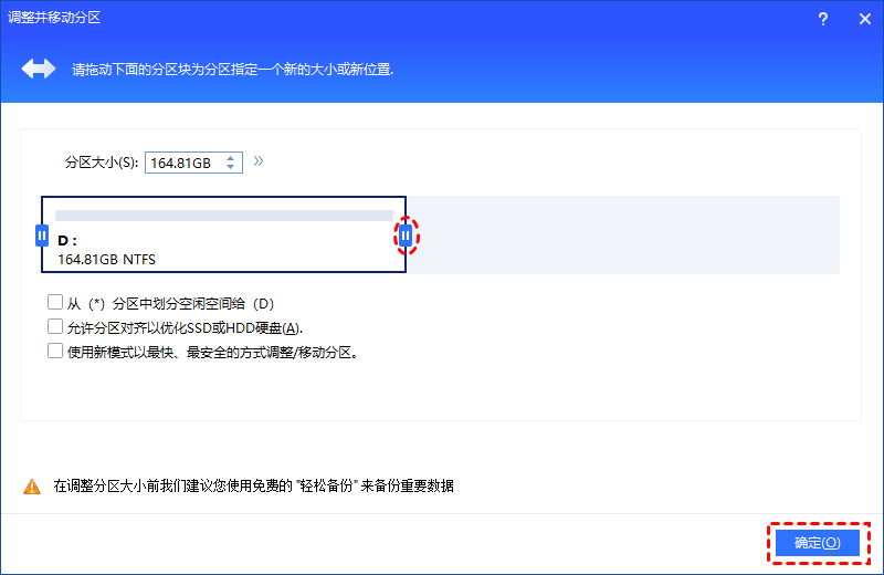 步骤2. 在弹出的窗口中,你可以通过拖动分区左右两侧的黑色小圆点设置分区大小,将未分配空间纳入D盘,调整完成后,点击"确定"按钮。