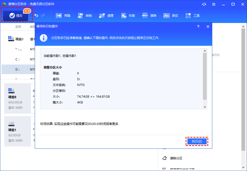 步骤3. 单击左上角"提交"按钮以预览即将进行的任务,确认无误后单击"执行"即可开始把未分配的磁盘合并到D盘。