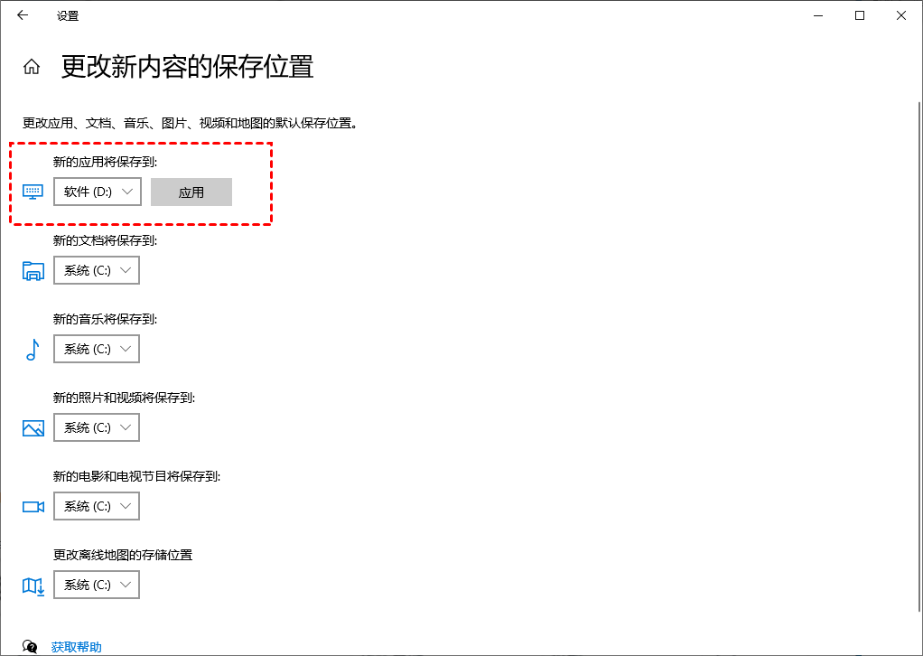 3. 将"新的应用将保存到"、"新的文档将保存到"等选项修改为D盘。