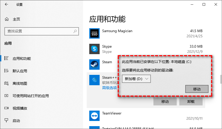 Windows 10/11系统自带应用移动功能,适合迁移从Microsoft Store安装的UWP应用。传统桌面软件(.exe安装)大部分不支持此功能。
