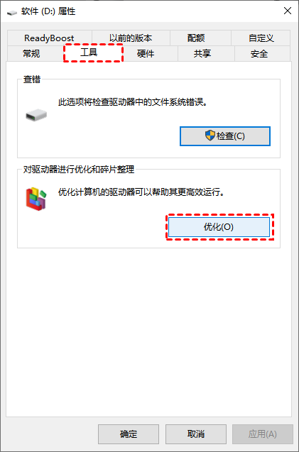 2. 在属性界面点击“工具”栏,再点击“优化”。