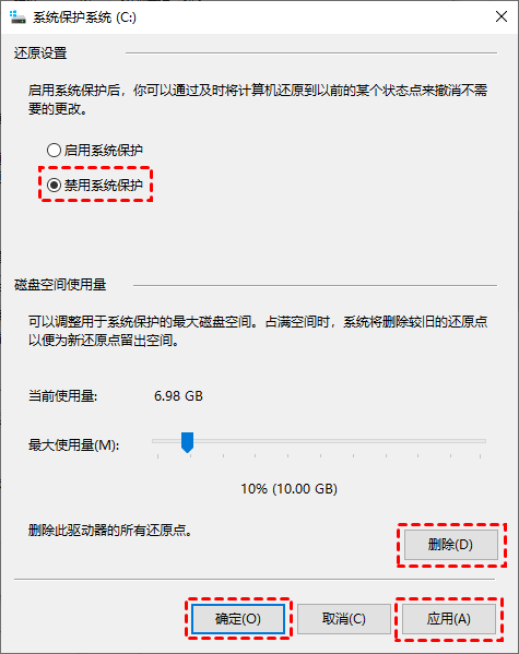 3. 选中“禁用系统保护”关闭系统保护,再点击“删除”删除所有还原点,然后点击“应用”和“确认”即可。