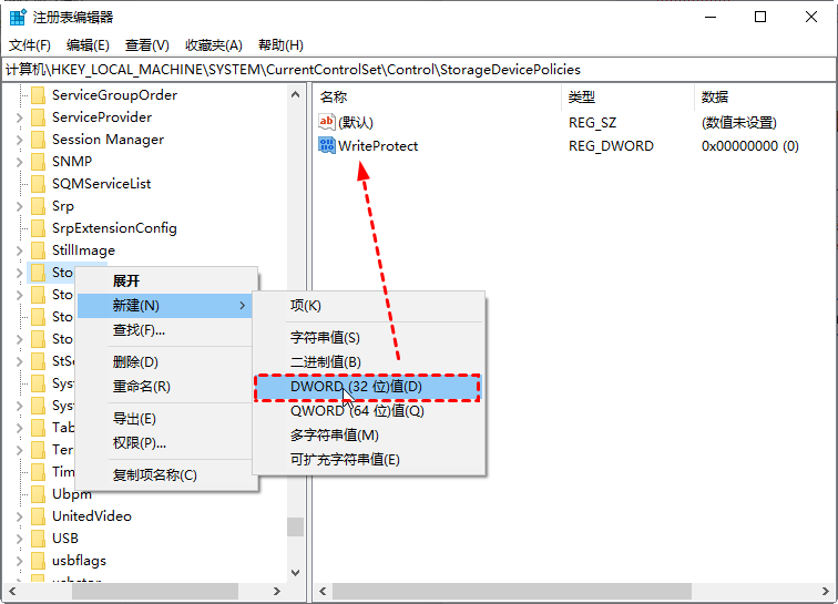 ✎ 提示:如果StorageDevicePolicies下没有WriteProtect选项,您可以手动创建规则,将其命名并将值设置为0。