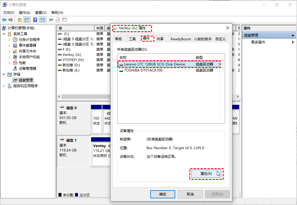 步骤1. 在磁盘管理中,右键单击U盘并选择“属性”。在弹出的窗口中,选择“卷”选项卡。然后单击U盘并选择“属性”。