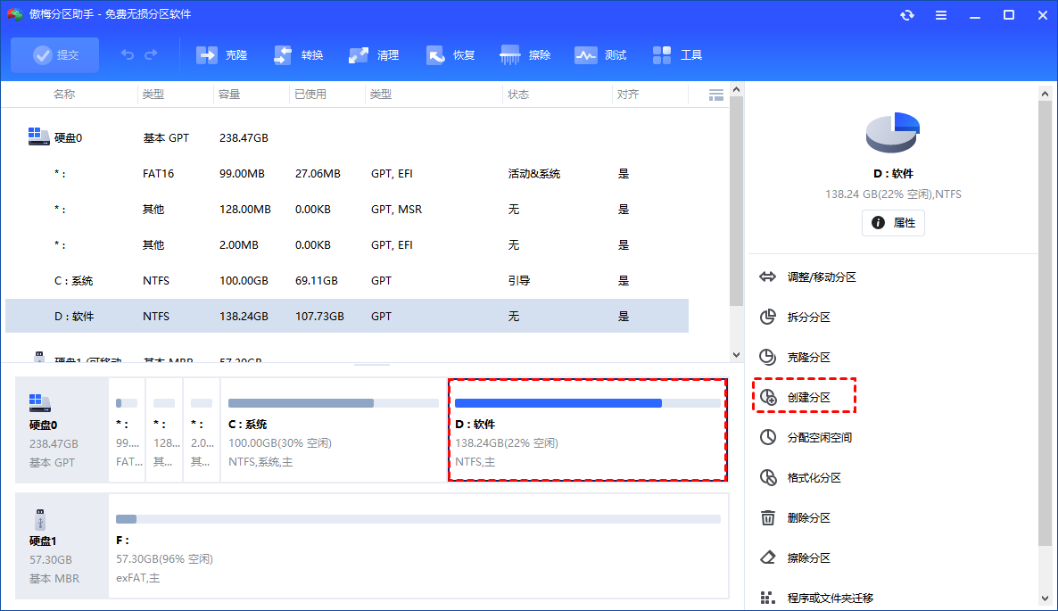 第一步:启动傲梅分区助手,右键点击你那个硕大的C盘,直接选择“创建分区”。是的,就是这么简单直观!