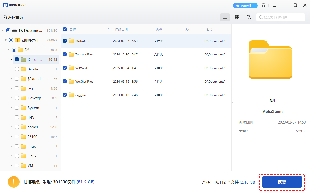 如果上述方法无法使用或使用后无效,那你还可以使用专业的文件恢复软件,如傲梅恢复之星。该软件使用起来既简单又快速,它可以自动扫描和过滤所有丢失或删除的文件。