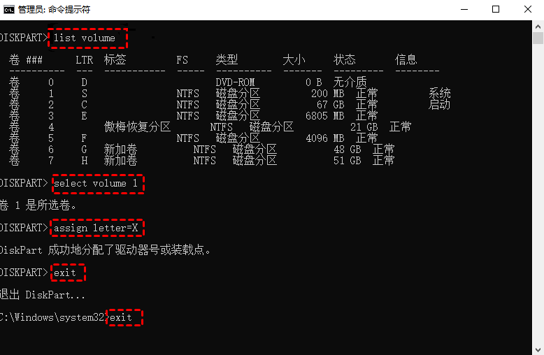 如果你可以在磁盘管理中看到丢失的分区但标有星号,你可以尝试通过命令提示符重新分配驱动器号来解决问题,该方法操作步骤如下: