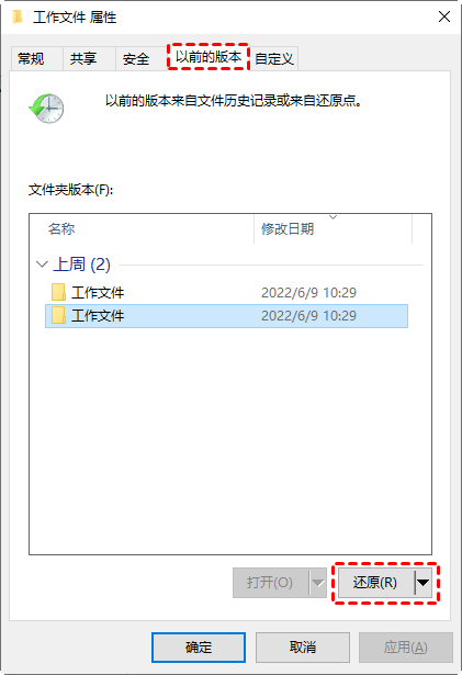 2. 切换到“以前的版本”选项卡,选择合适的历史版本,点击“还原”。
