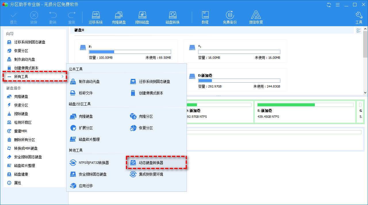 那么有没有简单安全的转换办法呢?当然有!您可以使用傲梅分区助手,它带有动态磁盘转换器,可以轻松简单安全的帮您实现动态磁盘转换为基本磁盘的操作。除此之外,分区助手也是一款好用的分区管理软件,除了基本的分区功能外,还能实现无损MBR转GPT、磁盘克隆等。